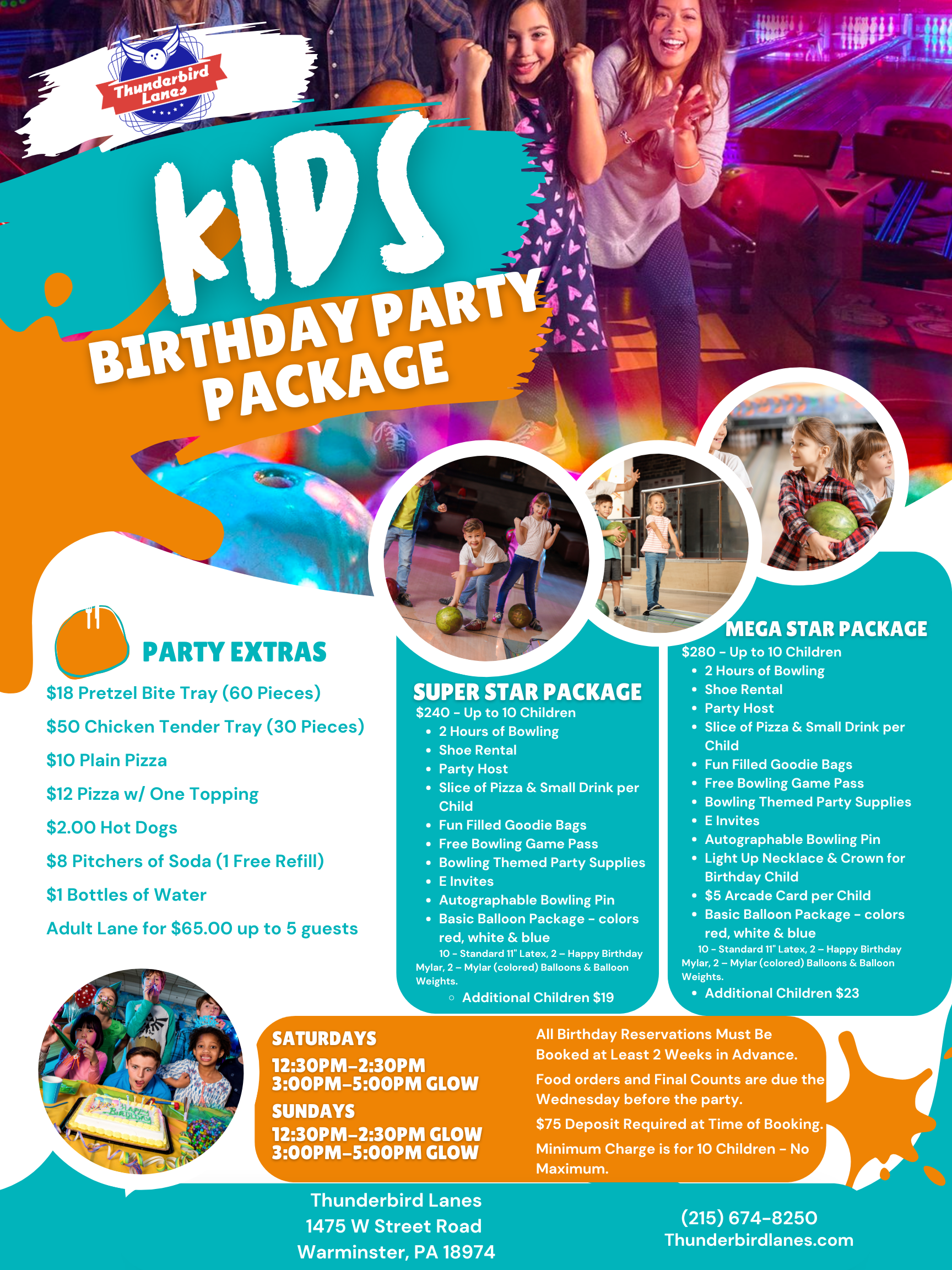 Childrens Birthday Parties are a blast at Thunderbird Lanes. Tons of fun for the kids and stress free for mom and dad. See our packages below.